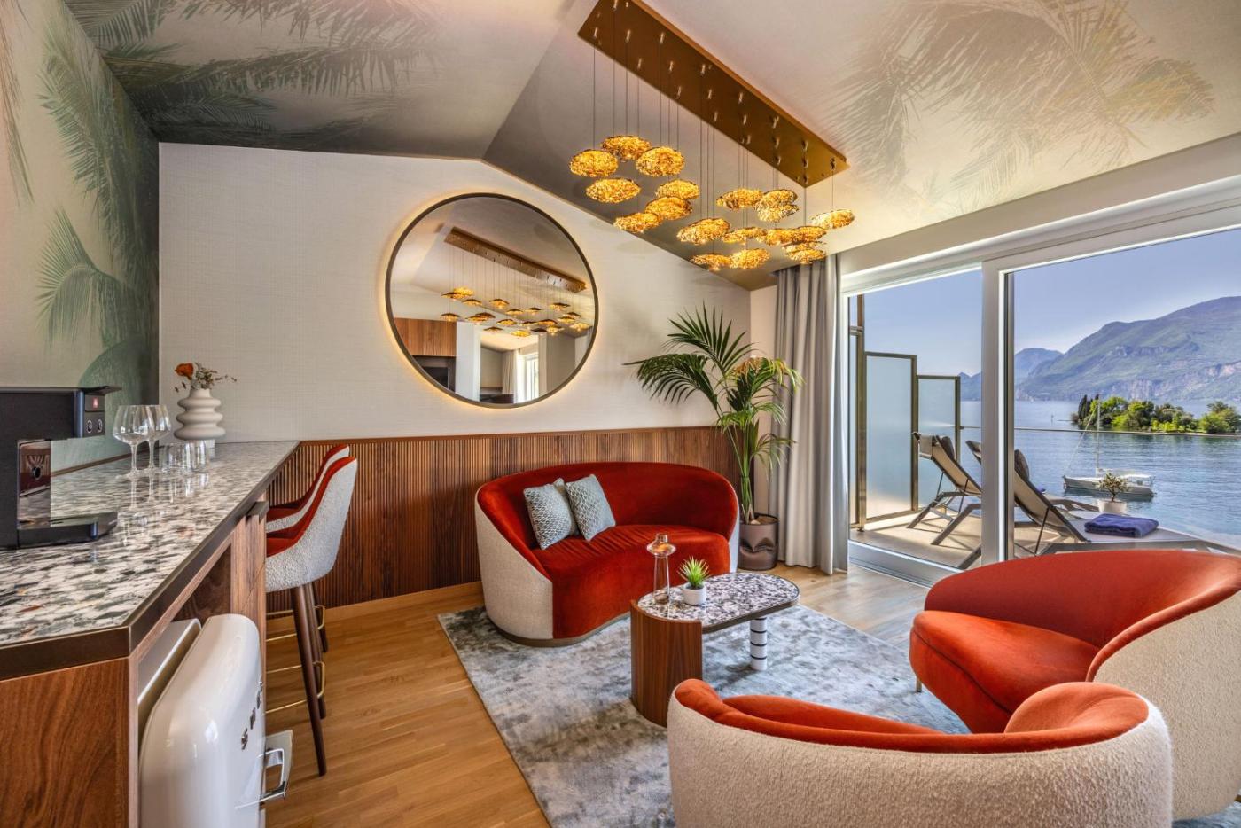 Suite Deluxe. La sauna rappresenta il fiore all’occhiello di questa suite. All’interno è presente un ambiente spazioso composto da 1 soggiorno, 1 camera da letto separata e 2 bagni con doccia a filo pavimento edi cortesia. Questa sistemazione climatizzata dispone di TV via cavo a schermo piatto, pareti insonorizzate, minibar, vista sul lago eper la preparazione di tè e caffè. L’alloggio presenta 1 letto. ;